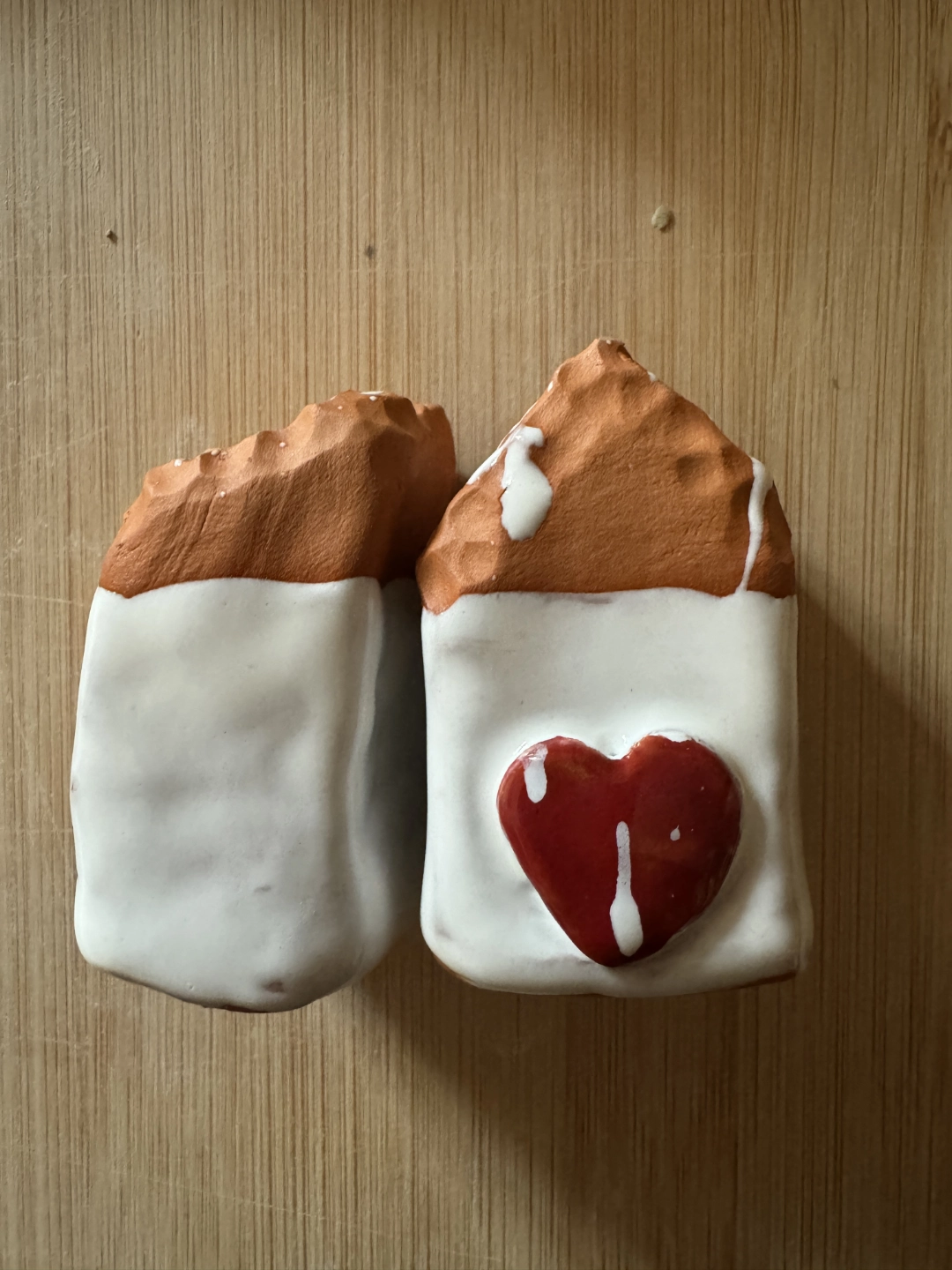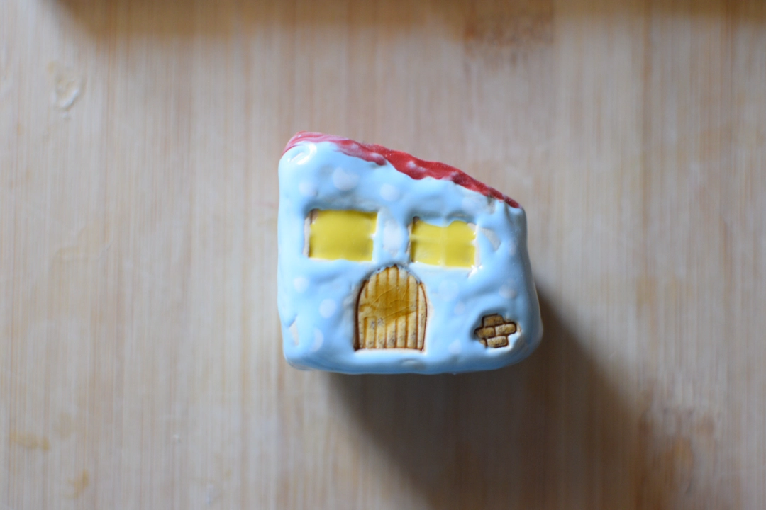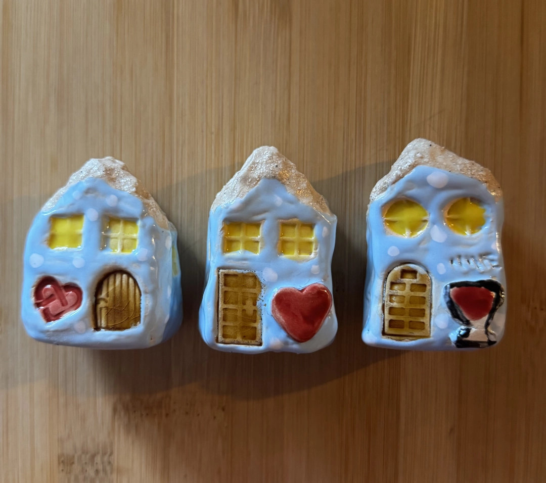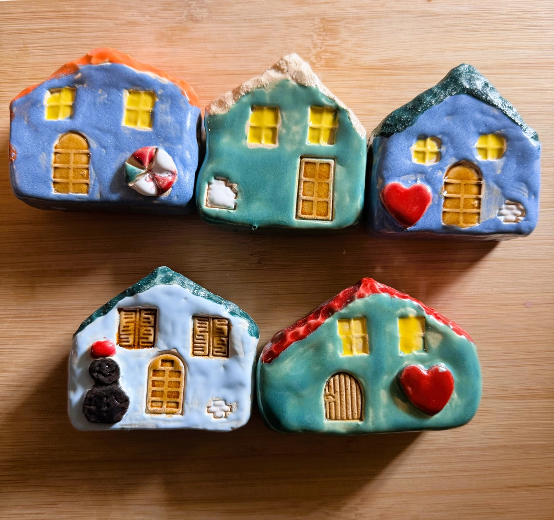 The elephants are made by hand from white clay. They are fired at 1,050 degrees, hand glazed and fired again at 1,050 degrees. Size: 4 x 9 cm or 5 x 10 cm.